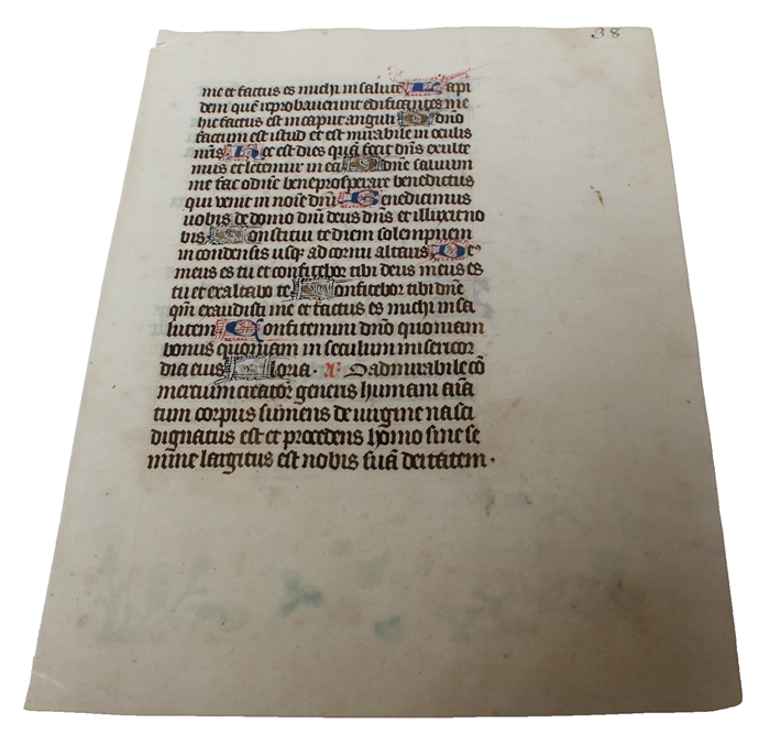 4to (195 x 142). 1 leaf of vellum, 21 lines of text and 10 small initials, 5 in gold (recte) and 18 lines of text and 2 initials in gold (verso). Light soiling.