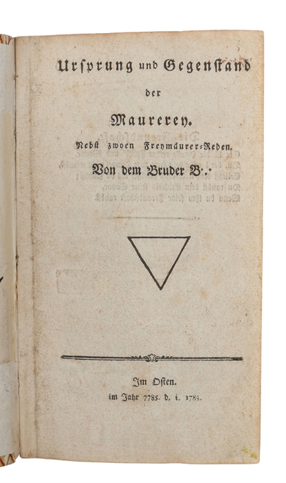 Scarce first edition of this German Masonic tract on the origins and purpose of Freemasonry, with two lodge orations, published under a fictitious imprint (“Im Osten”). Rarely found in the trade.