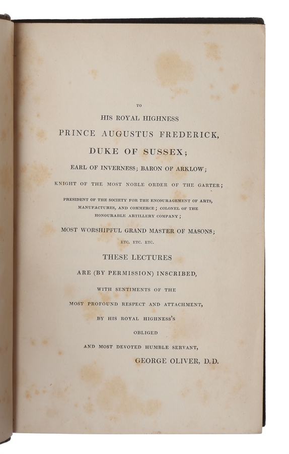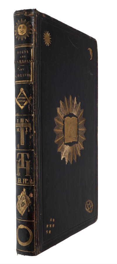 Rare second edition of one of the classic nineteenth-century works on Masonic symbolism. In a series of twelve lectures George Oliver examines and interprets the most important emblems, allegories and ritual symbols of Freemasonry, including the square and compasses, the sun and moon, the Temple of Solomon and the symbolic tools of the various degrees. "Oliver George (1782–1867), topographer and writer on freemasonry, was descended from an ancient Scottish family, some members of which came to England in the reign of James I, and were subsequently settled at Clipstone Park, Nottinghamshire. He was born at Papplewick, Nottinghamshire, on 5 Nov. 1782, and, after receiving a liberal education at Nottingham, he became in 1803 second master of the grammar school at Caistor, Lincolnshire. Six years afterwards he was appointed to the headmastership of King Edward's grammar school at Great Grimsby. He was ordained deacon in 1813, and priest in 1814; and in July 1815 Bishop Tomline collated him to the living of Clee, when his name was placed on the boards of Trinity College, Cambridge, by Dr. Bayley, subdean of Lincoln and examining chaplain to the bishop, as a 'ten-year man.' In the same year he was admitted as surrogate, and a steward of the clerical fund. He had been elected deputy past grand master of masons for Lincolnshire in 1832, and in 1840 he was appointed an honorary member of the grand lodge of Massachusetts, with the rank of deputy grand master.” (Dictionary of National Biography)