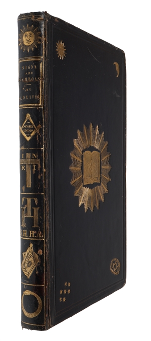 8vo. Bound in a contemporary richly decorated full calf binding, elaborately tooled in gilt with Masonic symbolism. The covers are framed by blind-tooled fillets. At the center of each board appears a radiant sunburst composed of finely gilt rays, in the center a an open bible with the square and compasses, the principal emblem of Freemasonry. The corners are decorated with smaller symbolic tools and emblems, while the upper boards feature gilt sun and crescent moon motifs. All edges marbled. Edges of boards, spine and hinges with wear. Verso of front board stating “J. A. Grantham, Wincle, Chechire”. In hand: “Gift of F. P. Reynold”. Internally with light occasional brownspotting. XV, (1), 272, 6, (2) pp.