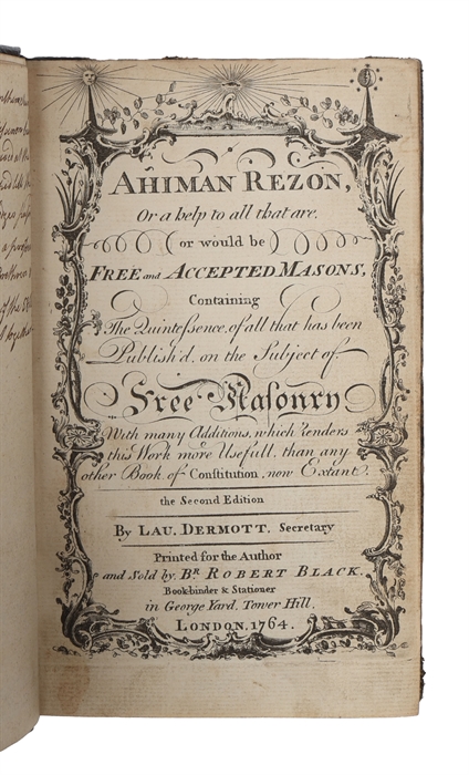 Exceedingly are second edition of Dermott’s “Ahiman Rezon”, a constitution for the Ancient Grand Lodge of England which was formed in 1751, the rival Grand Lodge’s answer to Anderson’s Constitutions. In his book Dermott attacked the pretensions and authority of the Grand Lodge of England.