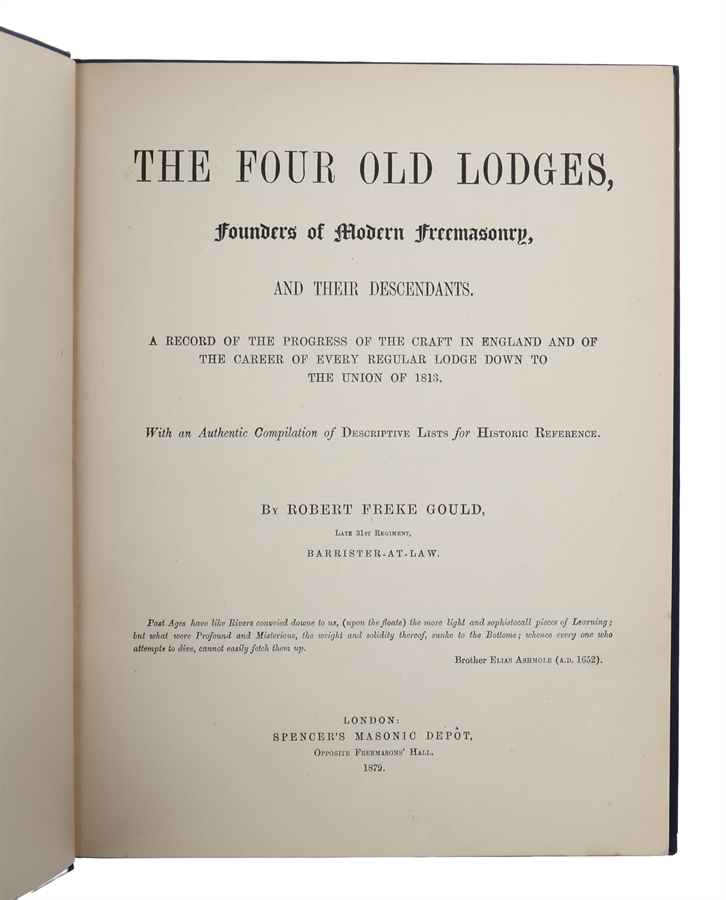 Rare first edition of Gould’s first book in which he explores the history and traditions of four ancient Masonic lodges. The lodges are the Lodge of Antiquity, the Grand Lodge of England, the Lodge of Reconciliation and the Grand Lodge of Scotland. The author writes about the origins of each lodge, tracing their development over time and highlighting key events and persons that have shaped their history. He also provides insights into the rituals and practices of each lodge, drawing on his own experiences as a member of the Masonic fraternity.