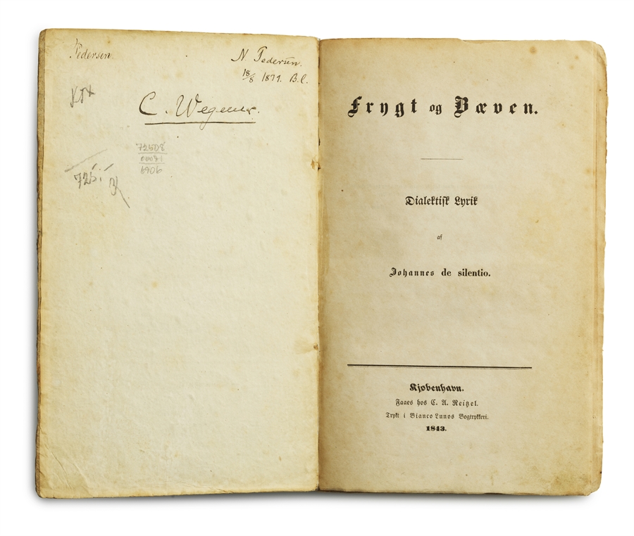 Old owners’ names to inside of front board (N. Pedersen 18/8 1879 and C. Wegener).