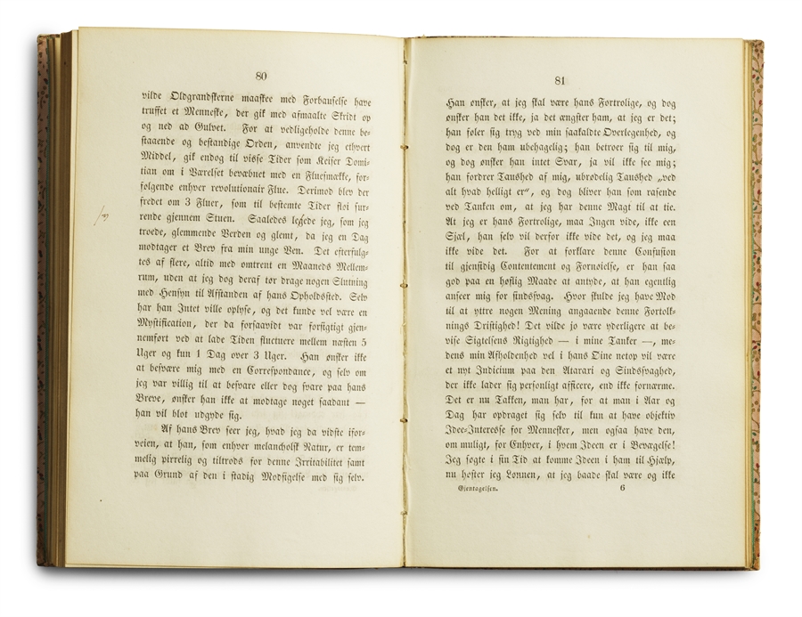 Kierkegaard’s own copy of Repetition, one of the two copies he had printed on special paper and specially bound, one for Regine, one for himself, with a correction in Kierkegaard’s hand. This is as close as one comes to the love story of Regine and Kierkegaard – this is Kierkegaard’s own copy that he kept himself, from the love-set of the two copies of Repetition he had made, where the other was for Regine. One of the two copies of the book that he had made on special paper and bound in this particularly beautiful and romantic binding with gilding and flowers. Kierkegaard had his eight pseudonymous works made like this, one for Regine, one for himself. So far, only four of these have surfaced, Regine’s copies of Repetition, Prefaces, and Either-Or (all three sold at auction in 2002), and Kierkegaard’s own copy of Either-Or (which is in the Danish Royal Library). The other copies are unregistered, and the whereabouts unknown. The present copy is presumably that described merely as “dainty w. gilt edges”, nr. 2125 from the auction catalogue, which Herman H.L. Lynge bought at the auction. The correction is to be found on p. 80, where “legede” (played) has been changed to “levede” (lived). See Pap. IV B99. REPETITION – not only the title of one of his most significant books, but also a key concept in the philosophy of Kierkegaard – was written during the same brief spell of feverish activity that also produced Fear and Trembling; the two books were even published on the same day. ”Say what you will, this question will play a very important role in modern philosophy, for repetition is a crucial expression for what “recollection” was to the Greeks. Just as they taught that all knowing is a recollecting, modern philosophy will teach that all life is a repetition.” (Repetition, p. 3 – translation by Hong), Kierkegaard states in the beginning of his treatise, anticipating the importance that his concept of Repetition is to have for modern philosophy. Written in the narrative form of an experimental novel centered on two stories that are internally linked, Kierkegaard lets us understand what Repetition could be and what it is in his philosophy. The first story portrays Repetition as something empty and trivial, whereas the second portrays it as an ethical category that is inextricably linked to religion. Repetition is that which makes it possible for man to become and to remain present in the present. Kierkegaard’s explanation of his key concept of Repetition is exhausted in the present work, but it also plays a significant rôle throughout his later works and is considered one of the key concepts in his philosophy. The work is centered around the story of a young man, who has fallen in love with an innocent young girl to whom he has become engaged. But, finding himself unable to consummate the love because of poetic stirrings inside himself, he tries to understand what is going on inside him and whether or not he should break off the engagement. The elderly Constantin Constantius, one of Kierkegaard’s numerous pseudonyms, interferes with the emotions of our young man and begins to conduct speculative experiments with him that are meant to investigate whether a repetition (of the relationship with the girl, of the young man’s feelings, etc.) might be possible. At the end of the first part, the young man flees Copenhagen and leaves the girl, presumably at her wits’ end. Later, she marries someone else, and the young man transforms into the true poet that he could only be when unattached to the girl he loved. It does not take much of an imagination to link this story to the Kierkegaard’s own wildly famous love story and failed engagement to Regine Olsen. It all begins in 1837, when Kierkegaard meets the lovely young girl Regine Olsen at a visit to the widowed Cathrine Rørdam. Three years later, in September 1840, after having corresponded frequently with her and visited her on numerous occasions, Kierkegaard decides to ask for her hand in marriage. She and her family accept, but the following day, Kierkegaard regrets his decision and ends up finally breaking off the engagement in October 1841. Disregarding the scandal, the heartbreak (his own included), and the numerous pleas from family members and friends alike, Kierkegaard’s tortured soul, still searching for God and for the meaning of faith, cannot continue living with the promise of marriage. Later the same month, he flees Copenhagen and the scandal surrounding the broken engagement. He leaves for Berlin, the first of his four stays there, clearly tortured by his decision, but also intent on not being able to go through with the engagement. As is evident from his posthumously published Papers, Kierkegaard’s only way out of the relationship was to play a charming, but cold, villain, a charlatan, not betraying his inner thoughts and feelings. Despite the brevity of the engagement, it has gone down in history as one of the most significant in the entire history of modern thought. It is a real-life Werther-story with the father of Existentialism as the main character, thus with the dumbfounding existentialist outcome that no-one could have foreseen. This exceedingly famous and difficult engagement became the introduction to one of the most influential authorships in the last two centuries. “She was the reason for my authorship”, Kierkegaard writes in his Papers, and there is no doubt that several of his most significant works are born out of the relationship with Regine – and its ending. It is during his stay in Berlin, his first of four altogether, right after the rupture of the engagement, that he begins writing Either-Or, parts of which, like Repetition, can be read as an almost autobiographical rendering of his failed engagement. Repetition, more than any other work, lets us see how Kierkegaard came to be as an author through his tumultuous inner life during his engagement and the endin