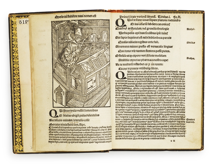 Exceedingly scarce early edition of Badius’ great Navis Stutifere, his moral magnum opus and one of his most important works. The work was inspired by Brandt’s “Das Narrenschiff”, and like Brandts’ work, Badius’ Navis Stultifere (which uses the same title in Latin and refers to Badius on the title-page) is also a treatise on contemporary morals and the vices of man, written in Latin verse and with prose commentaries. This magnificent work is considered one of the most beautiful French books from the beginning of the 16th century. This is the fourth edition of the work, magnificently illustrated with the wonderful suite of the 114 original woodcuts from Brandt’s work (1494). The first edition was published in 1505 and the second and third in 1507 and 1513 respectively. All of the early editions are of the utmost scarcity. Badius’ Navis Stultifera must not be confused with his Stultiferae Naves from 1500, which Badius characterized as a supplement to Brandt’s work, directed at women, whereas the present work, which was first published in 1505, is a moral work in its own right, inspired by Brandt’s, together with Badius’ own prose interpretations, being a much freer, original, and personal work. The work should also not be confused with a mere Latin translation of Brandt’s work, as this is Badius’ interpretation and original rendering of moral values inspired by Brandt, not an actual translation. If anything, it can be called an original reworking, with original prose commentaries, of Brandt’s “Narrenschiff”, caricaturing the human vices of different social classes. Badius has divided the text into 113 verse parts, each of them accompanied by a prose explanation differing significantly from Brandt’s text. Each verse chapter is also accompanied by one of the magnificent woodcuts as well as a poem. The poems are frequently drawn from the classics such as Virgil, Horace, and Juvenal, but also from Baptista de Mantua. As the frequent reprinting of it also points to, Badius’ great moral work was hugely influential. As Renouard suggests (I:164), the quotations and moral commentary, plus its frequent reprinting in the early 16th century, could point to its use as a school text. "The role of printers and the printing press as agents of cultural change in the period of transition between medieval and early modern times is generally considered to be of major importance. The development and spread of printing in the last decades of the fifteenth century and the first half of the sixteenth century was a significant factor in the diffusion of humanist thought and criticism. Some of the printers who presided over the publication of classical and contemporary works were active scholars and committed humanists themselves, supplying comments on the works that came off their presses. In France one of the most influential scholar-printers of the era was the Flemish-born Jodocus Badius Ascensius (1462–1535). From 1503 onwards, he ran his own printing office in Paris, where he published an impressive number of classical and humanist texts, often preceded by a preface in his own hand. Best known for his activities as a printer- This lovely copy has excellent provenance: 1.Edward Hailstone (1818-1890), Yorkshire solicitor and churchwarden, renowned British book collector and antiquary; fifth son of the botanist Samuel Hailstone (1767-1851). 2.Colonel Charles Leonard Frost Robinson, also a great book collector, who immigrated to America from England in 1907 and in 1911 became the president of the Colt Firearms Company in Hartford, Connecticut. Only 9 or 10 copies of the 1515-edition are listed in libraries worldwide, and the book, in all its early editions, is very rare in the trade. We have only been able to find very few copies at auction within the last 50 years. Brunet I, 1206; Renouard II, 84:6.