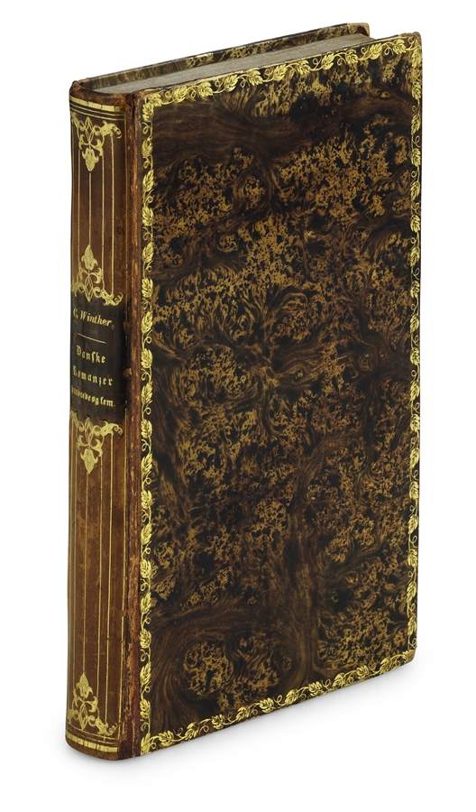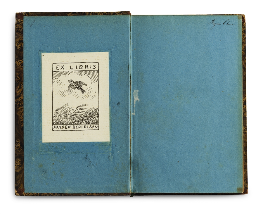 First edition of Christian Winther’s lovely collection of Danish romantic poems, with the very neat and meticulously written ownership signature of the young Regine Olsen ("Regina Olsen") - Søren Kierkegaard's fiance and lifelong muse - to front free end-paper. The name that has gone down in history as one of the most important muses in philosophy, Regine, is also frequently known – perhaps even more significantly so – in the variation Regina. From February 2nd, 1839, e.g., we have the now so famous Kierkegaardian praise of the woman: “You, my heart’s sovereign mistress stored in the deepest recesses of my heart, in my most brimmingly vital thoughts, there where it is equally far to heaven as to hell–unknown divinity! Oh, can I really believe what the poets say: that when a man sees the beloved object for the first time he believes he has seen her long before, that all love, as all knowledge, is recollection, that love in the single individual also has its prophecies, its types, its myths, its Old Testament? Everywhere, in every girl’s face, I see features of your beauty, yet I think I’d need all the girls in the world to extract, as it were, your beauty from theirs, that I’d have to criss-cross the whole world to find the continent I lack yet that which the deepest secret of my whole ‘I’ magnetically points to – and the next moment you are so near me, so present, so richly supplementing my spirit that I am transfigured and feel how good it is to be here…” (EE :7 1839, SKS 18, 8). Here, Kierkegaard plays with the name of his beloved, his “mistress”, whose name in Latin (with an “a”) means queen. The entry originally merely had “my heart’s sovereign mistress”, but afterwards, Kierkegaard inserted the name of her – the one –, Regina, the queen of his heart. This has been the source of much interpretation. Some see in this the onset of the transformation of the actual, physical girl into the poetically spiritual figure, who is doomed to never becoming anything but that of which immortal writing is made. (See e.g. Garff, Regines Gåde, p. 46). Kierkegaard also elsewhere alludes to Regina (see NB3 :43 1847, SKS 20, 268) and in a draft of a letter to Schlegel from 1849, where he wishes to rekindle contact with Regine, of course with the approval of her husband (who did not accept), he refers to her as “a girl, who poetically deserves to be called Regina”, ending the passus with telling Schlegel that he makes her happy in life, whereas Kierkegaard will secure her immortality. (SKS 28, 255). Regine herself, perhaps prompted by Søren’s use of it, would also later sign herself Regina (see letters to her sister Cornelia sent from the West Indies). It is evident from the ca. 30 letters we have from Kierkegaard to Regine, covering the engagement period (September 1840-October 1841), that during that period, Søren would occasionally send Regine presents along with his letters. These presents include flowers, perfume, a scarf, a copy of the New Testament, candle sticks, a music rest, and a “painting apparatus”. But we know little of what could have come before. Could there have been an actual engagement present? Kierkegaard does not mention it in his diaries nor in any letter still known or preserved. What would he have given her? It is pure speculation, but it does not seem unreasonable that he would have given her a book – a recently published one – that contains some of his favourite romantic poems from some of his favourite Danish poets, poets that he quoted in his love letters to Regine, a book compiled by the poet he treasured more than anyone else, Christian Winther, and which also contained poems by one of the people he treasured the most as a person, a near father figure for him and one of the finest poets (and philosophers) in Denmark, Poul Martin Møller … Had he given her one such book, it would have been beautifully, exquisitely, and possibly slightly romantically bound. And she would have written her name in it – with all probability, seeing that it came from him, the name that he gave her in 1839 – Regina Olsen. This lovely publication by Christian Winther of Danish romantic poems contains extracts of the loveliest of Danish golden age romantic poetry. Apart from Winther’s own six contributions, the collection contains romances by all the greatest Danish poets of the period, among them Hans Christian Andersen, Baggesen, Grundtvig, Hauch, Heiberg, Ingemann, Poul Martin Møller, Paludan Müller, Oehlenschläger, and others. In the present work of Danish romantic poems gathered by Winther we find all but 2), which was only published the year after, in 1840. Added to that is another lovely detail, namely that Regine at the end of letter 139 to her from Kierkegaard has written a little quotation herself, namely part of a poem from Johannes Ewald’s Fiskerne (see SKS 28, 226,27). That exact part of the larger work Fiskerne, entitled Liden Gunver, from which Regine here quotes, is also to be found in the present work of Danish romances. REGINE OLSEN It is safe to say that Regine Olsen occupies a place like none other in Kierkegaard’s life. Their love story is one of the most intriguing in the history of intellectual thought and has always been an inevitable source of fascination for anyone interested in understanding Kierkegaard. It is not so much the love story itself, the engagement, and the rupture of the engagement that is responsible for the lasting importance that Regine has come to have upon Kierkegaard-reception and -scholarship, as it is Kierkegaard’s own, endless reflections upon it and his constant insistence that she – the one – is the reason he became the writer that he did. Regine is inextricably linked to Kierkegaard’s authorship, and in his own eyes, she became the outer, historical cause of it. It is not only in his journals and in letters to his confidantes that Kierkegaard keeps returning to Reg