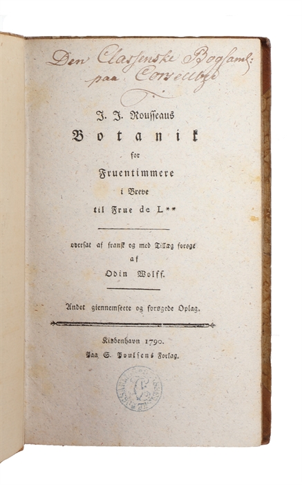 Uncommon second expanded Danish edition of Rousseau’s collection of letters on botany written by Rousseau to Madame Delessert, the mother of one of his young students. The work shows his appreciation for Linnaean classification and includes both scientific and philosophical reflections on nature. Bibliotheca danica II, 186.