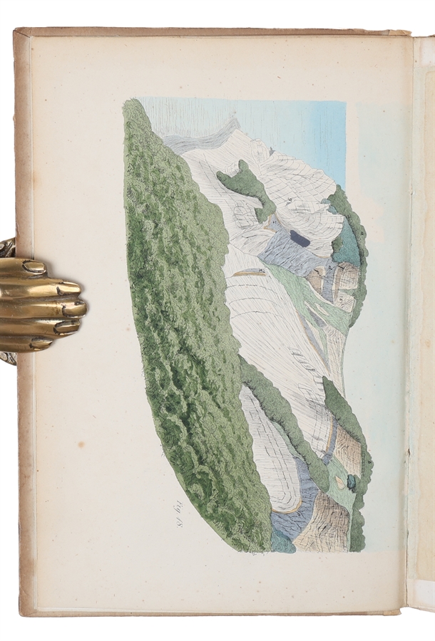 8vo. With the original printed wrappers pasted on to contemporary boards. With light browning to extremities, upper part of spine with minor loss to the wrapper. Internally with light occassional marginal browning, an overall nice copy. (12), XXXII, 287 (1) pp. + 6 handcoloured plates (including the frontispiece), 2 engraved maps and 4 folded profiles of which 1 is coloured. 55 woodcut illustrations included in the paggination.