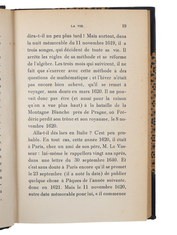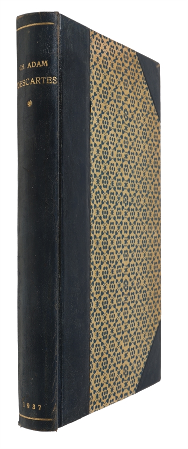 8vo. With the original front wrapper in a contemporary half calf binding. Gilt title to spine. Exlibris to inside of front board. Inscribed by the author to the prominent Danish librarian Valdemar Hansen to half title. A few marginal notes and underlinings in pencil. Frontispiece portrait of Descartes. 178 p.