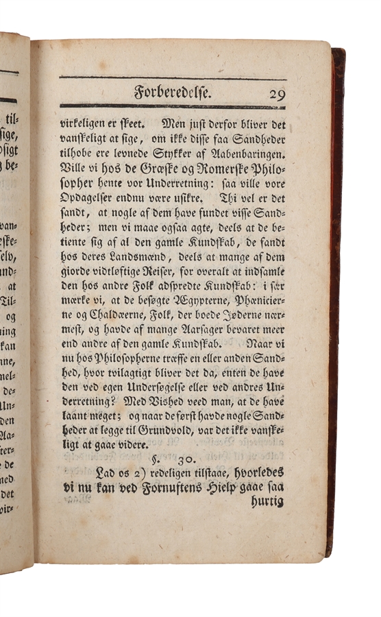 8vo. I et samtidigt hellæderbind med rygforgyldning. Forgyldt rygtiteletiket og fire ophøjede bind på ryg. En smule slid ved ydre false og kanter af permer. Navnetræk på forsatsbladet. Lidt spredte brunpletter, ellers ren indvendig. 272 p.