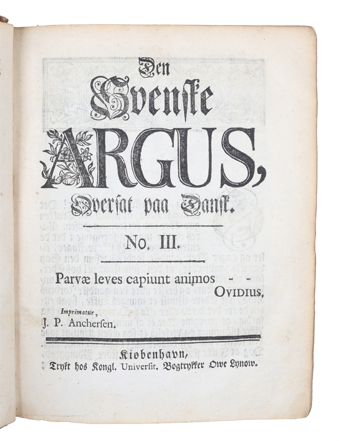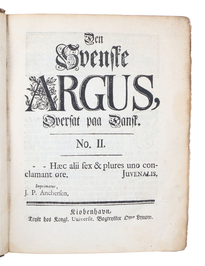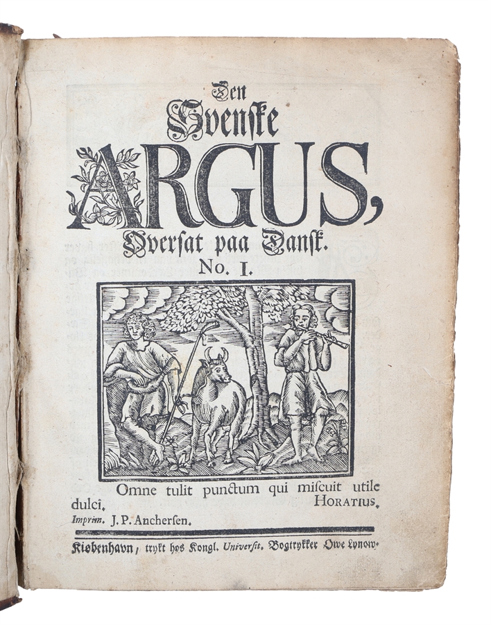 The rare first Danish translation of the very popular "Then swänska Argus" (1732–34), modeled on Joseph Addison’s Tatler and Spectator. This periodical helped introduce the ideas of the Enlightenment into Sweden, but its language and literary style were of even greater importance; it is regarded as ushering in the age of modern Swedish prose. This present Danish translation exerted some influence both on Riis’s Danske Spectator and on Holberg, who mentions it in the preface to Moralske Tanker.