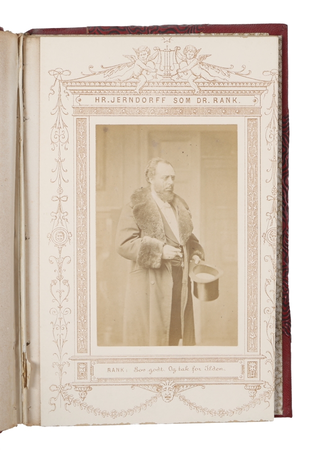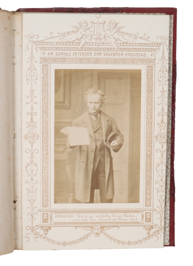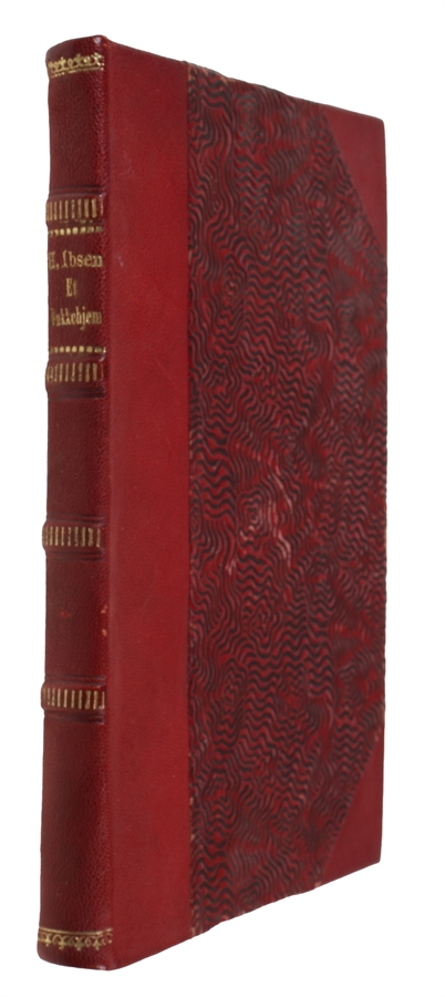 8vo. In contemporary red half calf with four raised bands. Light wear to extremities. Text-leaves with marginal brownspotting. Plates a bit weak in inner margins. 8 ff. + 8 original photographs from the first Danish perfomance of "Et Dukkehjem".