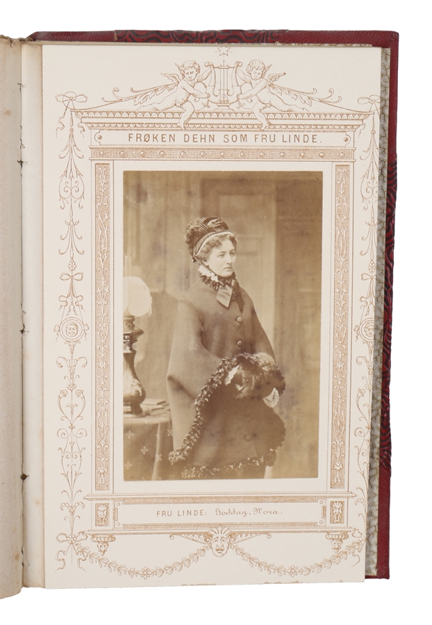 Rare first edition, documenting the historic first staging of Ibsen’s "Et Dukkehjem" at the Royal Danish Theatre in Copenhagen in December 1879. The volume contains eight original photographs of the actors in role, making it one of the earliest attempts at theatrical photography in Denmark, and one of the few surviving contemporary visual records of the play’s groundbreaking early performances. The accompanying text is by Herman Bang (1857–1912), the Danish critic and novelist, whose essay puts Ibsen’s work within the broader cultural and social debates of the period. “Et Dukkehjem” quickly became one of the most influential plays of the modern stage, starting discussions on marriage, gender roles and individual freedom. OCLC only list three copies.