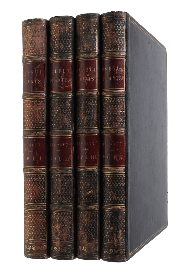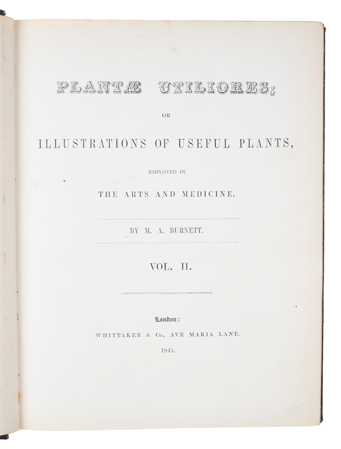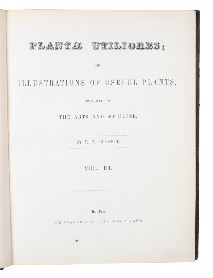 First and only edition of this beautiful book of medicinal plants, with 260 magnificent plates my Miss M. A. Burnett in stunning hand-colouring. Mary Ann Burnett was one of the foremost femaile Victorian-era botanists, as well as author, and illustrator. She is primarily famous for her stunning botanical artwork, most natable of which is the grand four-volume Plantae Utiliores. The 260 plates in this wonderful work are known for their scientific precision as well as their beauty and vibrant colours. This Victorian-era work of medicinal plants with its scientific descriptions and accounts of the medicinal and culinary uses of the plants brings to mind the herbals of preceding centuries, but has a rare artistic appeal - and is the work of a female artist and scientist. Part of the text is by botanist Gilbert Thomas Burnett, Miss Burnett's brother. The work is rarely found in coplete state as here. Nissen; 305; Pritzel 1400. "Most of the text was drawn from notes left by Miss Burnett's brother G.T.B." (The Library of the Stiftung fur Botanik, Liechtenstein. Sotheby's Sales Catalogue. 1975. No. 118). Sitwell: p. 83.