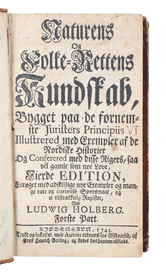 Fjerdeudgaven af Holbergs måske største bogsucces. Alle udgaverne af Holbergs Natur- og Folkeret er af største sjældenhed.