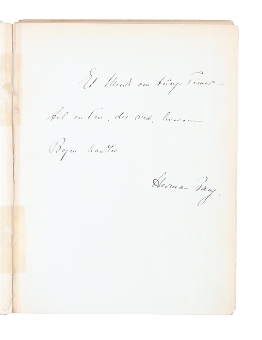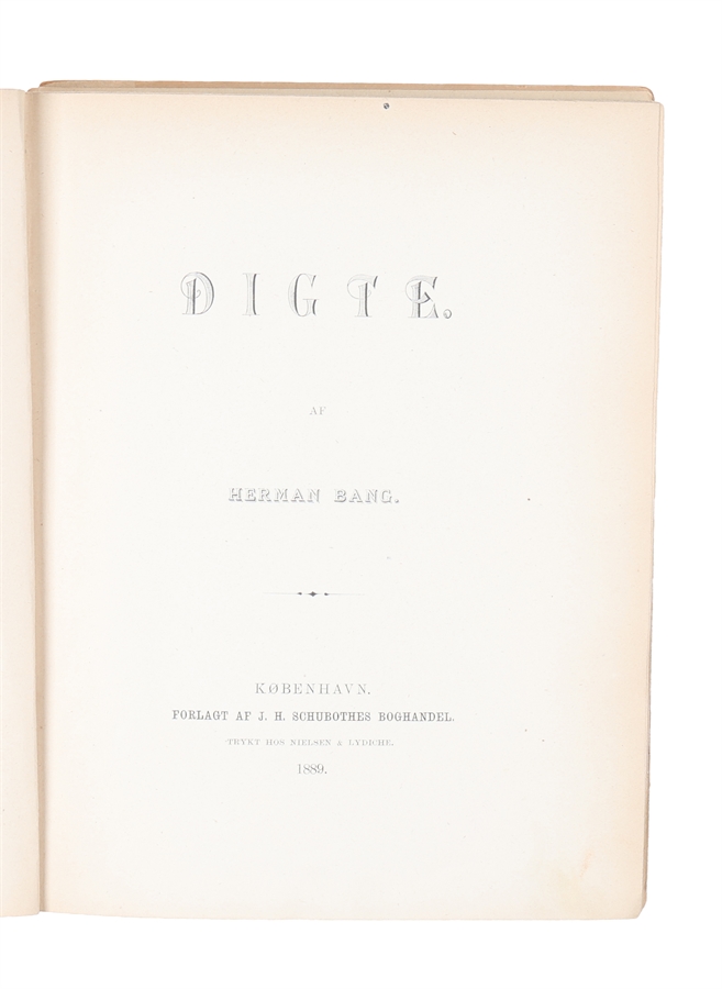 8vo. I det originale forlagsbind med forgyldt titel på forperm. Ryggen defekt, begge permer løse. Med egenhændig dedikation fra Bang på titelblad: "Et Minde om tunge Timer - / til en Ven, der ved, hvorom Bogen handler. / Herman Bang." (4), 118, (2) pp.
