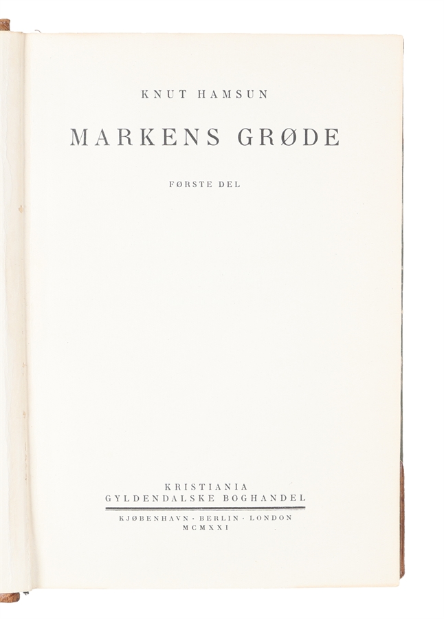 A magnificent copy of the first edition of Hamsun’s mature magnum opus “Growth of the Soil” - one of the greatest classics of the 20th century and the work that earned Hamsun the Nobel Prize (1920) - the great actor Olaf Fønss’ copy, with a handwritten visiting card from Hamsun to Olaf Fønns. The handwritten text (in Norwegian) on the card reads “Hr. Olaf Fønss, Tusen Tak for / Boken! Igjen like viril! Graanet, erfaren, / kanske ogsaa slitt paa, men like lys og like / ukuet. / Med Hilsen fra min Kone og / Deres / Knut Hamsun. / Nørholm, 27/10 31.” (I.e. Mr. Olaf Fønss / a thousand thank yous / for the book! Again, just as virile! Greying, experienced, / perhaps also worn, but just as bright and just as / indomitable / With greetings from my wife and / your / Knut Hamsun / Nørholm, 27/10. 31.” Olaf Holger Axel Fønss (1882-1949) was one of the greatest actors of the era, one of the biggest silent film stars of Denmark and Germany. Apart from being an actor and a top matinee idol, he was also a writer, director, producer, and film censor. Although we have not been able to determine it for sure, it is very likely that Fønns will have played Hamsun characters on the stage at some point, perhaps also Isak Sellenrå, the main character of “Growth of the Soils”. At least, the present copy of the work would suggest so. “Growth of the Soil” is one of the greatest novels of the 20th century, and it profoundly shaped the way of modern literature. It is widely regarded as one of the best books of the 20th century. Thomas Mann called it ”a wonderful, extraordinary book”; Heminway wrote about the book, from Switzerland, to Fitzgerald in Paris, recommending him to read is, as it was so good; André Gide (as many others before and after) compared Hamsun to Dostojevsky, but commented that he was more refined; Singer was hypnotized by him; Knausgård considers the work hypnotizing; Kafka was utterly fascinated, H.G. Wells was thoroughly impressed and called it one of the best novels he had ever read, describing it as beautiful through and through, etc., etc. “One of the most important and controversial writers of the 20th century... Hamsun influenced many of the major 20th-century writers who followed him, including Kafka, Joyce and Henry Miller." (George Egerton). Hamsun is considered "one of the most influential and innovative literary stylists of the past hundred years" (i.e. 1890–1990) (Robert Ferguson). He pioneered psychological literature with techniques of stream of consciousness and interior monologue, and influenced authors such as Thomas Mann, Franz Kafka, Maxim Gorky, Stefan Zweig, Henry Miller, Hermann Hesse, John Fante, James Kelman, Charles Bukowski, and Ernest Hemingway. Isaac Bashevis Singer called Hamsun "the father of the modern school of literature in his every aspect—his subjectiveness, his fragmentariness, his use of flashbacks, his lyricism. The whole modern school of fiction in the twentieth century stems from Hamsun". “When it was first published in 1917, Growth of the Soil was immediately recognized as a masterpiece. Ninety years later it remains a transporting literary experience. In the story of Isak, who leaves his village to clear a homestead and raise a family amid the untilled tracts of the Norwegian back country, Knut Hamsun evokes the elemental bond between humans and the land... Hamsun’s novel is a work of preternatural calm, stern beauty, and biblical power—and the crowning achievement of one of the greatest writers of the twentieth century.” (Penguin Classics).