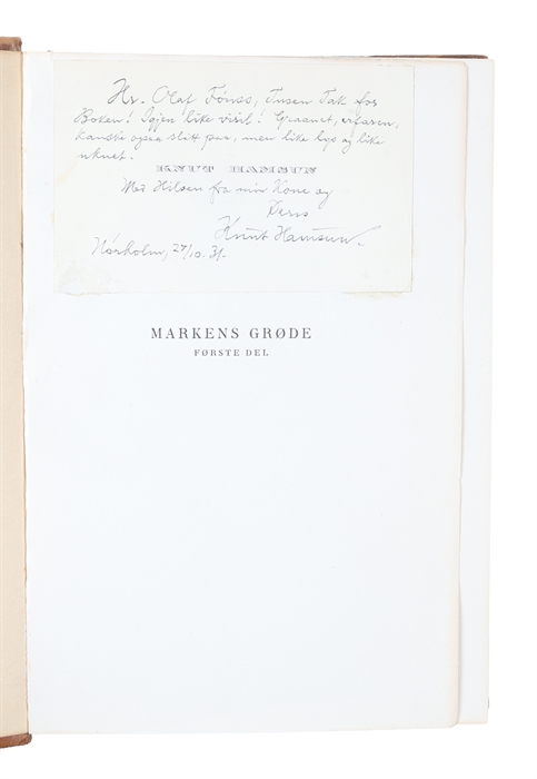 Inserted onto the half-title of vol. one is an original visiting card from Hamsun, imprinted "KNUT HAMSUN", with a seven-line handwritten and signed inscription in Knut Hamsun's hand, for Olaf Fønss, dated "Nørholm, 27/10. 31.".