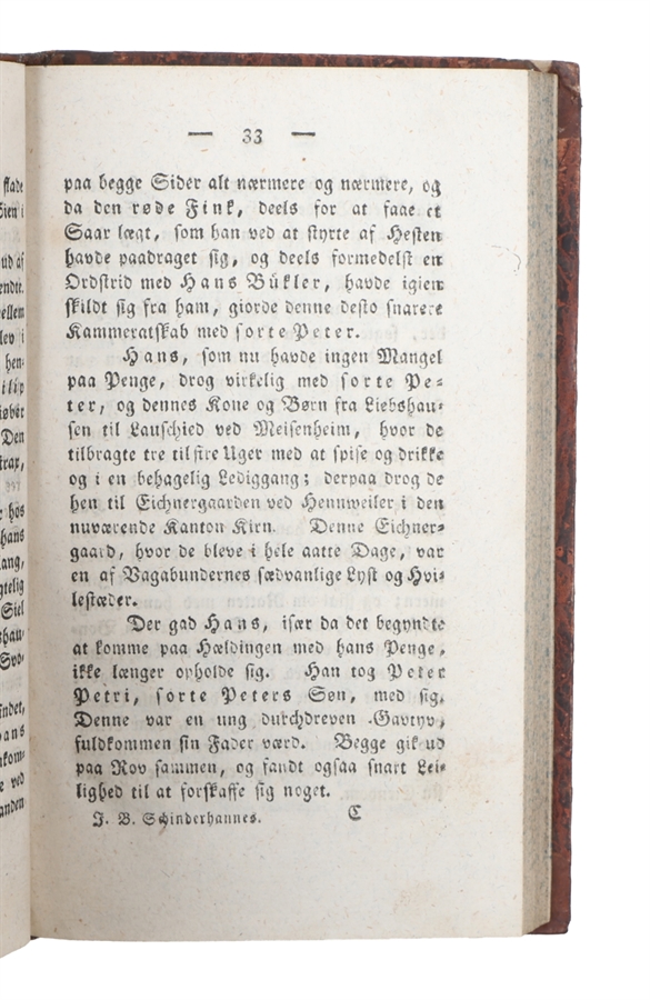 Rare first Danish translation, published same year as the German original, of the biography of the notorious Rhineland outlaw Johannes Bückler, also known as Schinderhannes. It describes his life, crimes, trial, and execution, claiming to be based on the official criminal records of the Mainz court.