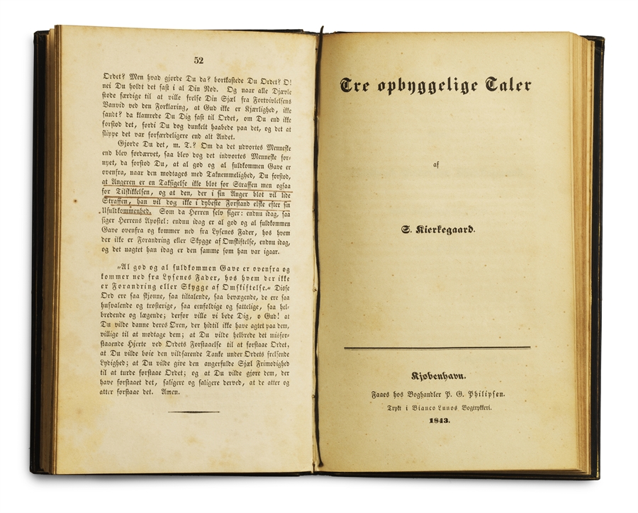 8vo. 52 pp. + 62 pp. + 84 pp. All three publications bound together in an absolutely magnificent full black fine morocco binding with richly gilt ornamental spine with gilt Gothic lettering: Opbyggelige Taler. No. 1-9. White moiré-endpapers. Boards with a single gilt line-frame inside which another gilt frame with ornamental corners. Edges of boards and inner dentelles with gilt single line-ornamentation. All edges gilt. A truly magnificent binding with just minimal wear and no restorations of any kind. Printed on varying paper, one quire being thinner than the rest. Some browning and light brownspotting. Old owner’s names to front fly-leaf and previous owner’s neat pencil annotations to front and back free end-papers, explaining that this is Kierkegaard’s own, personal copy, and the further provenance of it.