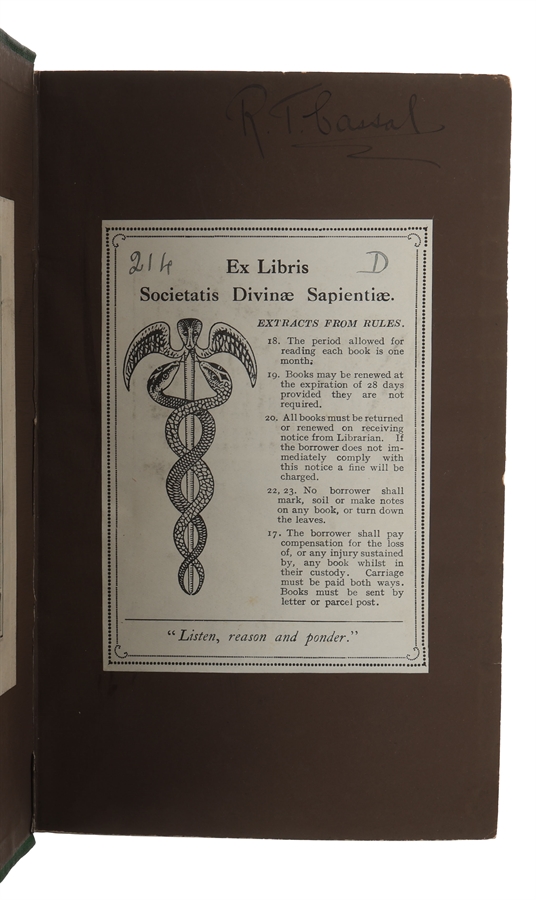 8vo. Original green full cloth with gilt lettering to spine and gilt illustration of Buddha to front board. Spine a little darkened and wear to capitals. Inner front hinge open and partly cracked, but still honlding. Inner back hinge weak. Unopened and internally very nice, clean, and fresh. With the large book plate of Ernest Ridley Debenham to inside of front board and ex Libris of Societatis Divinae Sapientiae to front free end-paper, along with old owner's signature. CLXXII, (206), 24 (advertisements) pp.