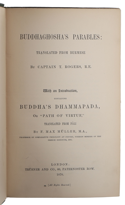 Scarce first edition of the highly influential first English translation of the Dhammapada, along with Buddhaghosha’s Parables. Excerpts of the Dhammapada had appeared in English in the periodical The Friend printed in Colombo, Sri Lanka, but a full English translation, which is based upon Fausböll’s version (from 1855, being the first European edition of a complete Pali-text as well as the first Latin translation of the Dhammapada), only appeared in 1870. Today, the Dhammapada is probably the most frequently translated Buddhist text in the world. The Dhammapada, the extremely influential collection of sayings of the Buddha in verse form, constitutes one of the most widely read and best known Buddhist scriptures. The original version of the Dhammapada is in the Khuddaka Nikaya, a division of the Pali Canon of Theravada Buddhism. Each saying recorded in the collection was made on a different occasion in response to a unique situation that had arisen in the life of the Buddha and his monastic community. “The Dhammapada is the best known and most widely esteemed text in the Pali Tipitaka, the sacred scriptures of Theravada Buddhism. The work is included in the Khuddaka Nikaya ("Minor Collection") of the Sutta Pitaka, but its popularity has raised it far above the single niche it occupies in the scriptures to the ranks of a world religious classic. Composed in the ancient Pali language, this slim anthology of verses constitutes a perfect compendium of the Buddha's teaching, comprising between its covers all the essential principles elaborated at length in the forty-odd volumes of the Pali canon.” (The Dhammapada. The Buddha's Path of Wisdom. Translated from the Pali by Acharya Buddharakkhita with an Introduction by Bhikkhu Bodhi, 1996). Buddhist tradition has it that shortly after the passing away of the Lord Buddha, five hundred of his disciples met in council at Rajagaha in order to recall the truths they had received from their spiritual teacher during the previous forty-five years. They wanted these truths about moral and spiritual conduct to live on forever and for Buddha’s message to be available for all future disciples. The followers and Arhat felt the responsibility to convey the teaching and discipline of the Buddhist order as faithfully and truly as possible, and having no written texts to rely on, they prepared the many discourses for recitation with repetitions in various contexts, so that they could be remembered. Like the verses of Homer and other ancient works that were only written down later. “At that time, according to the Sinhalese, the Dhammapada was orally assembled from the sayings of Gautama given on some three hundred different occasions. Put in verse form the couplets contrast the vanity of hypocrisy, false pride, heedlessness, and selfish desire with the virtues of truthfulness, modesty, vigilance, and self-abnegation. The admonitions are age-old, yet they strike home today, their austerity of purpose fittingly relieved by gentle humor and earthy simile. Subsequently, several renditions of the Dhammapada in the Sanskrit and Chinese languages came into circulation; likewise, a number of stanzas are to be found almost verbatim in other texts of the canonical literature, testifying to the esteem in which its content was anciently held. Since first collated, the Dhammapada has become one of the best loved of Buddhist scriptures, recited daily by millions of devotees who chant its verses in Pali or in their native dialect.” (Bodhi, 1996). “The Dhammapada, an anthology of verses attributed to the Buddha, has long been recognized as one of the masterpieces of early Buddhist literature. Only more recently have scholars realized that it is also one of the early masterpieces in the Indian tradition of kavya, or belles lettres.” (The Dhammapada. A Translation. translated from the Pali by Thanissaro Bhikkhu). Buddhaghosha's Parables is a collection of Buddhist stories and moral lessons compiled by the Indian scholar and monk Buddhaghosha in the 5th century CE. The present first English translation includes 50 parables that illustrate various aspects of Buddhist philosophy and ethics. The stories cover a wide range of topics, from the importance of mindfulness and the dangers of attachment, to the virtues of compassion and the nature of enlightenment. Each parable is accompanied by a commentary that explains its meaning and relevance to Buddhist practice.