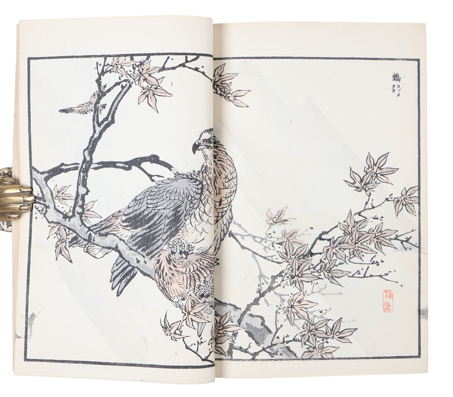 (24,5 x 16,5 cm.). Original wrappers. Sewn. Upper wrapper loose. Having 53 pages with 10 leaves of japanese text (incl. inside covers) and depicting 29 different birds on 43 pages of folded leaves. Single page plates and plates that span two adjoined plates in woodblock print in colour.