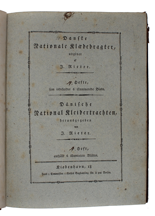 4to. Near contemporary (ca. 1850) full brown calf with richly gilt spine and blindstamped border to boards. Spine worn and capitals lacking a bit of leather. Front hinge cracked, strengthened from verso. Internally very nice and fresh with only occasional brownspotting. With the book-plate of John Arden to inside of front board. Bound with the original wrappers for the fourth and ninth series. The front wrapper for the ninth has the title written in English in contemporary hand to the top right (slightly cropped), in ink that seems identical to the "9" denoting the series number. 57 (out of in all 72 published) engraved an excellently hand-coloured plates of costumes, one present in two copies (plate nr. 67). All plates with Danish and German text in the plate. Apart from two leaves that are slightly smaller, the leaves measure 25,5x19 cm. The print surface on all measures 20,5 x 14 cm.