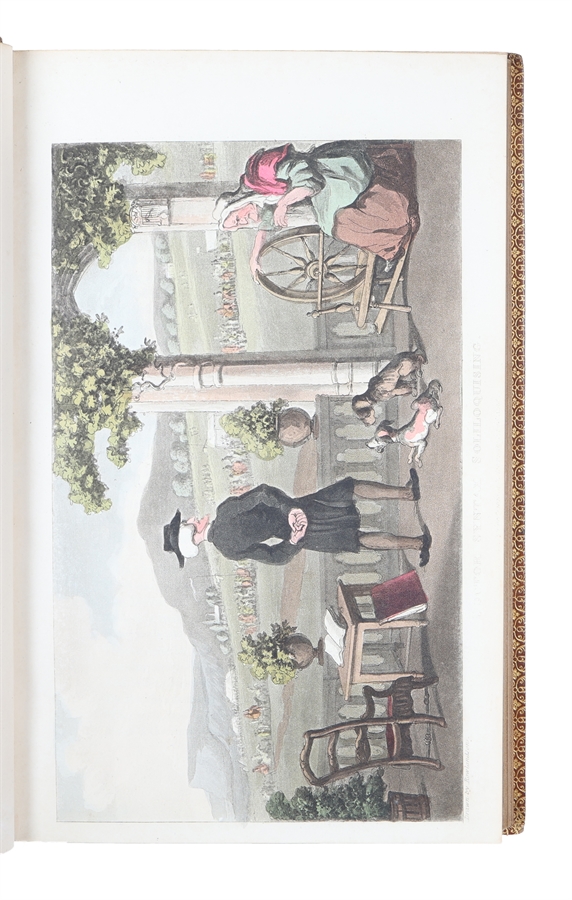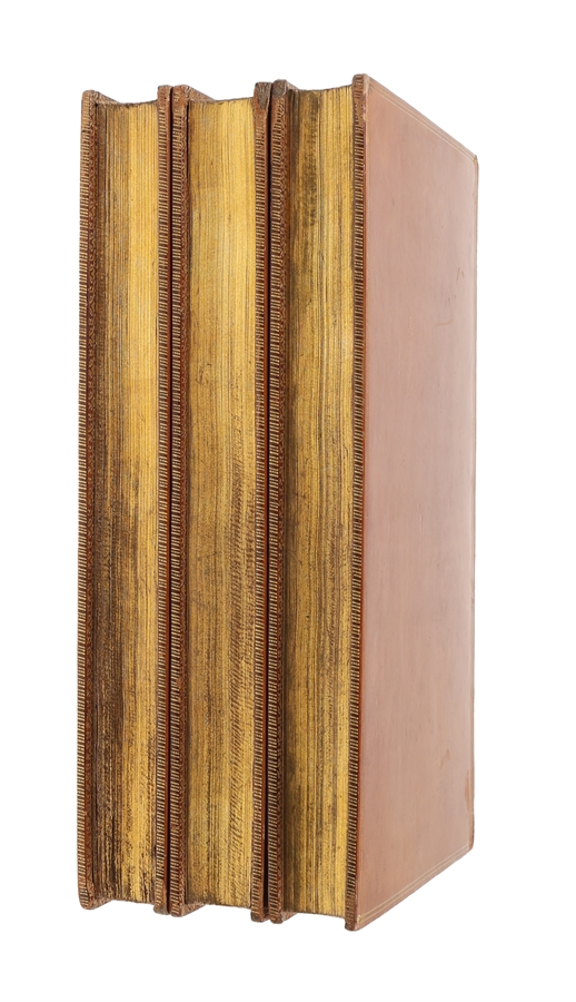 8vo. Bound in 3 fine uniform polished full calf. 5 raised bands. Richly gilt compartments, titlelabels in red and green. All edges gilt, gilt line-borders on covers, inner gilt borders (Bound by Riviere & Sons). 2 hinges slightly weakening, but not loose. Very slight wear to top of spines. Internally fine and clean with occassinally very faint offsettings from plates. With all 3 leaves of directions to Binder. With all 78 handcoloured aquatint plates (including 3 frontispieces), 2 handcoloured titles. Last "cul-de-lampe" also handcoloured. In the text woodengravings.