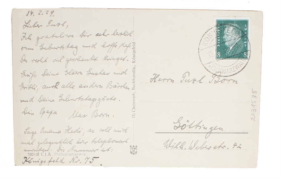 This lovely postcard written by Max Born at the height of his career, for his grandson, is in German and reads thus: "Lieber Puzl,/ Ich gratuliere Dir sehr herzlich/ zum Geburtstag und hoffe, dass/ Du recht viel geschenke kriegst./ Grüss Deine Eltern Gustav und/ Gritli, auch alle andern Bärrchen/ und deine Geburtstagsgäste./ Dein Opapa/ Max Born./ Sage Omama Hedi, sie soll mich/ mal gelegentlich hier telephonisch/ ausrufen. Die Nummer ist:/ Königsfeld Nr. 75." (I.e. Dier Puzl, I congratulate you on your birthday and and hope that you will recieve a lot of presents. Greetings to your parents Gustav and Gritli, and also to all other little bears and to your birthdayguests. Your grandfater Max Born. Tell grandma' Hedi that at some point she should call me by telephone. The number is: Königsfeld 75).
