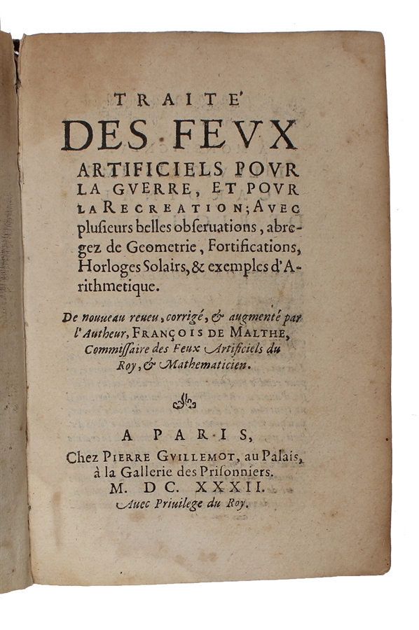 Second enlaged edition of this scarce treatise of fireworks for war and recreation. The work is divided in five sections: the first 56 pp. to war, pp. 57-146 to 'recreation' and pp. 147-277 to sundials, fortification, geometry and arithmetics. Of the English edition of 1629, Cockle says "This work, though in advance of anything so far written on the subject in English, does not attain to the standard of Thibourel and Appier. Yet it is with foreign treatises it must be weighed, for Malthus received his training in pyrotechnics abroad...It was Malthus who about the year 1634 introduced the mortar into the French service." - Klaus Jordan: 2328 (ed. 1629) - Chris Philip: M 040.3 - Cockle Nos 118 a. 939.