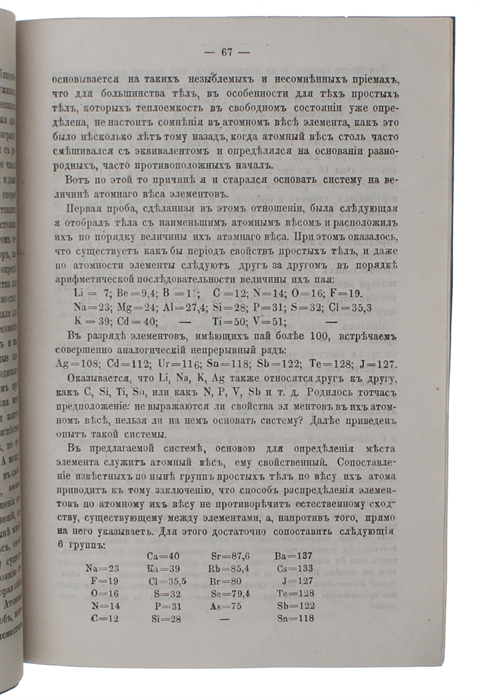 Exceedingly scarce first printing of Mendeleev’s seminal Russian Chemical Society-paper of March 1869, presenting for the first time the periodical table of the elements. “His newly formulated law was announced before the Russian Chemical Society in March 1869 with the statement “elements arranged according to the value of their atomic weights present a clear periodicity of properties.” Mendeleev’s law allowed him to build up a systematic table of all the 70 elements then known.” (Encycl. Britt.) “Early in 1869, Russian chemist Dmitrii Mendeleev was in a predicament many people are familiar with—he was facing a deadline. He had delivered the first volume of his inorganic chemistry textbook to his publisher but was struggling with how to organize the second volume. This struggle would culminate in a remarkable discovery, a system that classified all of the chemical elements. In March 1869, Mendeleev delivered a full paper to the Russian Chemical Society spelling out the most significant aspect of his system, that characteristics of the elements recur at a periodic interval as a function of their atomic weight. This was the first iteration of the periodic law.” (OSU) Mendeleev’s system was not yet perfect when it appeared in 1869, but it would prove to be one of the most fundamental of scientific laws, one that would hold true through new discoveries and against all challenges. Mendeleev not only recognized that what seemed to be a randomness of the elements fitted into a system, he also suggested that the gaps in his system would later be filled with elements yet unknown to the scientific world. The discovery of new elements in the 1870s fulfilled several of Mendeleev’s predictions and brought increased interest to the periodic system, making it an invaluable tool for research. “He had such faith in the validity of the periodic law that he proposed changes to the generally accepted values for the atomic weight of a few elements and predicted the locations within the table of unknown elements together with their properties. At first the periodic system did not raise interest among chemists. However, with the discovery of the predicted elements, notably gallium in 1875, scandium in 1879, and germanium in 1886, it began to win wide acceptance. Gradually the periodic law and table became the framework for a great part of chemical theory. By the time Mendeleev died in 1907, he enjoyed international recognition and had received distinctions and awards from many countries.” (Encycl. Britt.) Horblit 74 [Dibner 48 - citing the German translation of 1891]