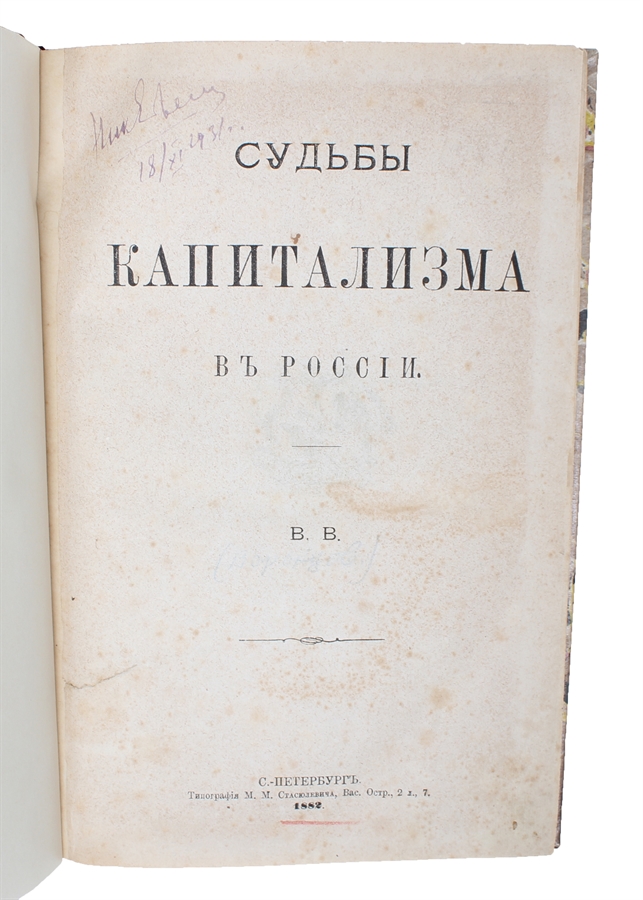 The exceedingly scarce first edition of this landmark work of Russian economics, being Vorontsov's seminal pre-revolutionary book "The Fate of Capitalism in Russia", which constitutes, not only the first serious attempt at analyzing Russian capitalism, but also one of the earliest (and the first Russian) theoretical statements of the assumption of economic development along non-capitalist lines. Vorontsov, together with Danielson - who was greatly inspired by the present work - is considered the major exponent of Narodnik (and pre-revolutionary) economics, of which the present work is essentially the epitome.