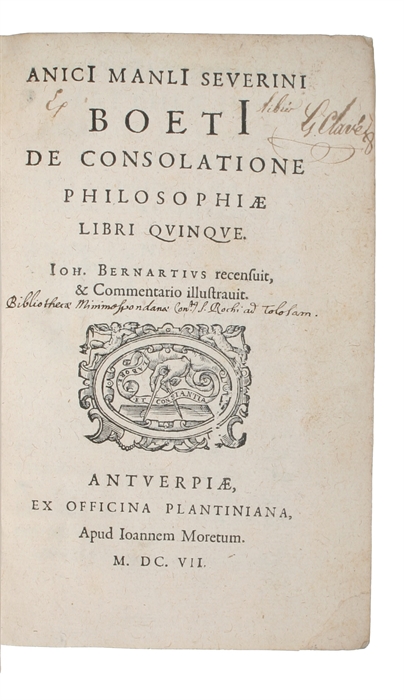 The beautiful and elegant Plantin-edition constitutes one of the most important commented editions of Boethius' work. It is renowned for Bernartius' excellent and extensive commentaries and the correctness of the text.