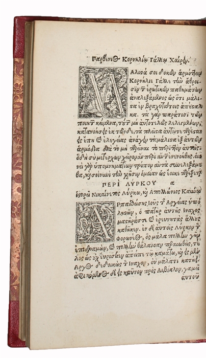 The extremely scarce first printing, of both the original Greek text and the translation into Latin, of Parthenius's only surviving work, the historiographically, mythographically, and literarily hugely important "Erotica Pathemeta" (or "Sorrows of Love"), which constitutes the only prose work by a Hellenistic poet to survive in its entirety and one of the few extant works of its genre, i.e the mythological or paradoxographical handbook, preserved from any period.