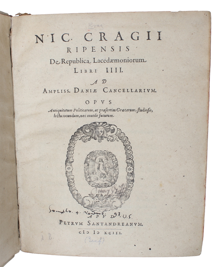 Alle 3 i originaludgave. Antageligt er disse 2 tilføjede skrifter udkommet sammen med hovedværket om Lacædæmonernes forfatning. De bærer alle 3 trykåret 1593. "In 1592 he became proifessor of Greek at the University of Copenhagen. In order to demonstrate his qualifications for the chair, he published this book dealing with the constitution of Sparta" (Thesaurus I, 166). - Ehr-M. IV:481-82. - Lauritz Nielsen, 1024 og 933.
