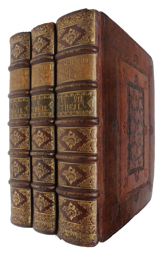 4to. Bound in 6 contemp. fine uniform full calf, richly blindtooled covers, Cambridge-style bindings. Raised bands. Richly gilt compartments. Tome-and titlelabels with gilt lettering. Some spineends with a little wear and one torn. S Stamps on title-pages. Engraved portrait as frontispiece, Engraved titlevignettes, fine engraved vignettes in the text and 145 (of 146 - one in xerox-copy) engraved plates (mainly double-page and folded). The 3 engraved maps missing. Internally clean and fine, printed on good paper. All 6 volumes have exceptionally fine endpapers with handcoloured flowers.