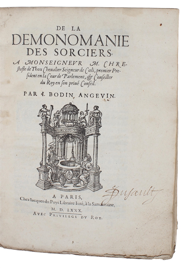 Scarce first edition of Bodin's seminal "Demon-Mania", the most important book on witchcraft of the era. The work profoundly influenced the position on witchcraft of the following half century and directly influenced the course of witch trials of this period. The work is furthermore of fundamental importance to the understanding of Bodin's tripartite world picture and constitutes an invaluable supplement to his "Six livres de la république".