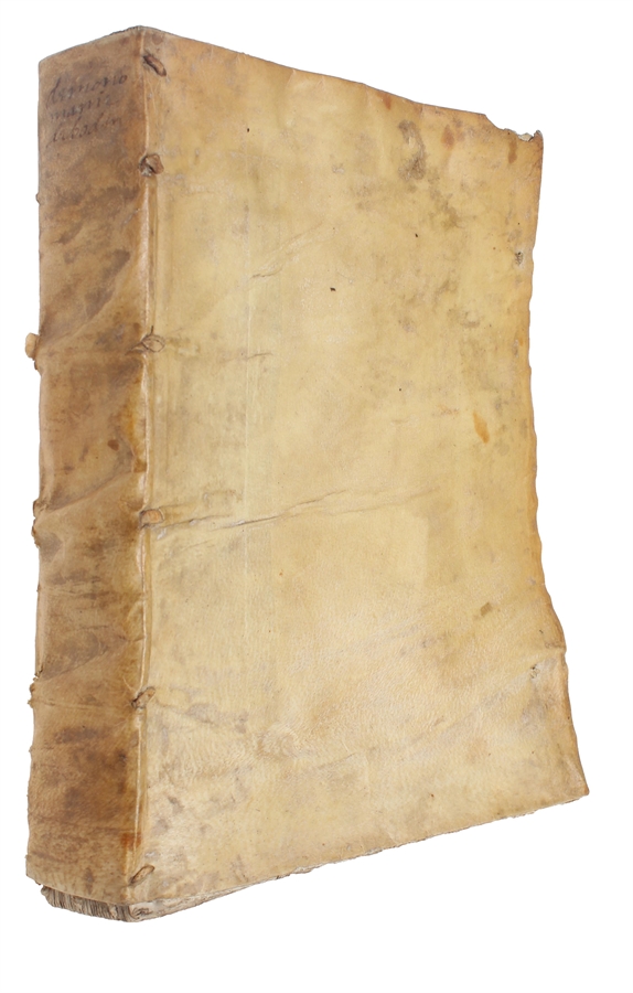 4to. Contemporary full vellum wih contemporary handwritten title to spine. Binding somewhat warped, but unrestored and tight. A (mostly very faint) damp stain to upper blak margin of some leaves (not affecting text), but otherwise internally very nice clean and fresh. Old owner's name to title-page (Dufault) and old acquisition note to front free end-paper. Woodcut title-vignette, woodcut headpieces, woodcut end-vignette, and a few woodcut initials. A large copy with good margins. (14), 252 (recte: 256) ff.