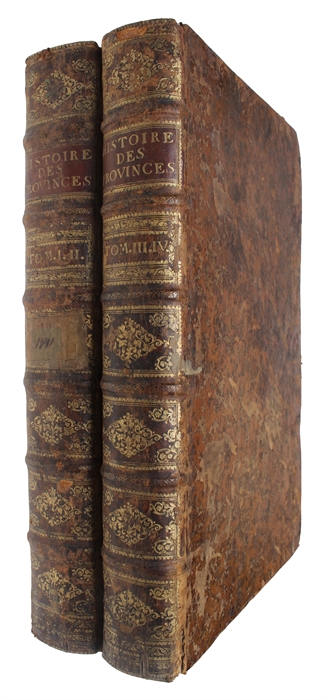 Folio. Bound in 2 contemp. full calf. 5 raised bands, richly gilt compartments. Tome-and titlelabels with gilt lettering. Some wear to spine-ends. A few small nicks at hinges. Corners a bit bumped. Minor scratches to covers. A stamp and old owner-name on titlepages. Title-pages in red and black. 3 engraved frontispieces. (18),342;(6),419,(16);(2),473 pp. 1 folded engraved map, 1 double-page folded plate. engraved vignettes. + (6),208 pp. With 396 engravings of medals (on 103). A few quires with some toning. In general clean and fine internally.
