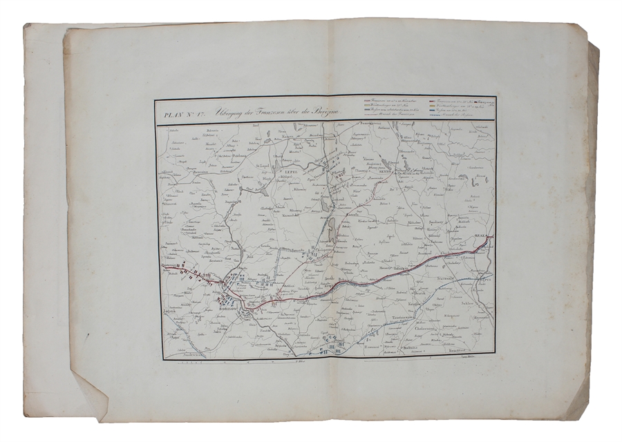 (Stuttgart und Tübingen, Cotta, 1822). Folio. (40 x 28,5). Contemp. blank wrappers. Tears to spine. Frontcover with printed list of the plans/maps. With 17 engraved plans/maps (many in double-folio) and with handcoloured positions + the large engraved map (58 x 69cm) "General Charte des Kriegs Schauplatz in Russland im Jahre 1812.." Maps/plans clean and fine.