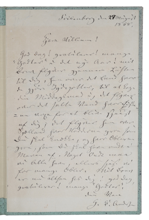 4.5. Autographed letter, signed "H. C. Andersen", for "Kjære William" (i.e. William Melchior). Dated " Frijsenborg den 27 August/ 1868. ".