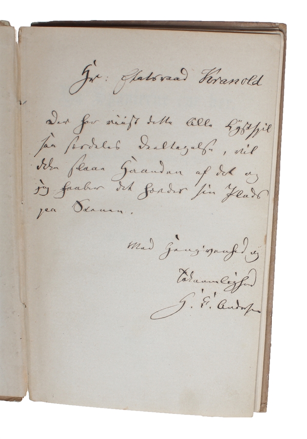 An excellent copy of the first edition of Andersen's famed play, in the scarce original binding and with a magnificent presentation-inscription to Rudolph Kranold, who at the time was director of the Royal Theatre in Copenhagen. His short reign here (until 1866) coincides exactly with the work on and premiere of one of the plays that was very closest to Andersen's heart, namely "When the Spanish were Here", which premiered at the Royal Theatre on April 6, 1865. Reading Andersen's diaries allows us to actually follow the play the entire way through to the stage. It is evident, both from his diaries and from the present presentation-inscription, that the play meant a lot to Andersen. As the inscription indicates, he's anxious that the play not be taken down again and he clearly asks Kranold to take good care of this play that is close to his heart.