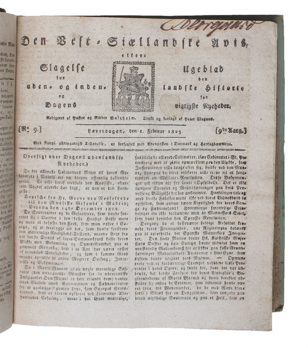 The extremely rare first printing of the 1823-issues of this slightly obscure newspaper, which contains Hans Christian Andersen's third publication. This exceedingly rare piece of Anderseniana was published when the master of the fairy tale genre was merely 17 years old, namely in February 1823. The present publication constitutes one of the two pieces of publication that are at the epicentre of the coming-to-be of the greatest poet and author to emerge from Danish soil. This little piece is a heartfelt, almost perfectly stylized poem that constitutes an obituary of Hans Christian Andersen's early benefactor, Gutfeld, who was responsible for Collin accepting to be Andersen's benefactor. It was due to Gutfeld and his belief in Andersen that he made it on into the world and was taken seriously enough - at the mere age of 17 - to later be allowed to follow his heart and his life dream - that of writing.