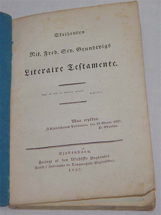 Den sjældne originaludgave, hvor Grundtvig giver sin berømte selvkarakteristik, han skriver bl.a." "Fredelighed er vel mig kun halv naturlig, nemlig som Bog=Orm"...