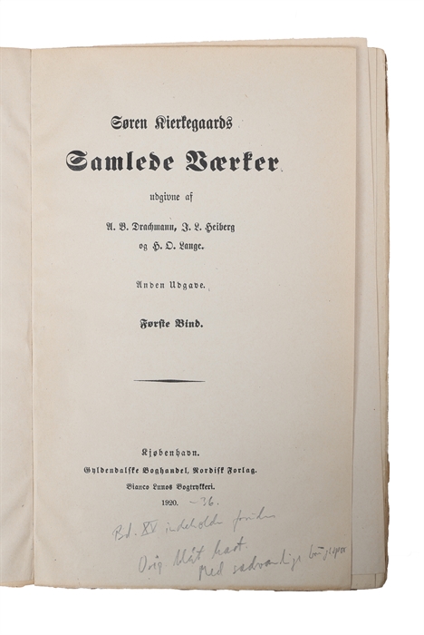 The second edition of Kierkegaard's collected works, uncut in the original blue boards with the original title labels.