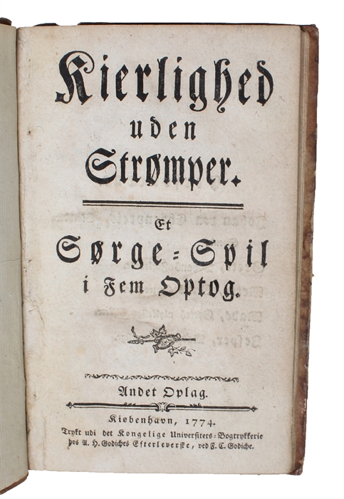 Kiøbenhavn, F.C. Godiche, 1774. Nydeligt, velbevaret samtidigt hldrbind. Ophøjede bind på ryggen. Rig rygforgyldning. Skindtite. Øverste kapitæl slidt. Eksemplaret har tilhørt forfatteren Adolph Engelbert Boye, som i 1826 på ny udgave Kierlighed uden Strømper. Med hans navnetræk "Boye" på indersiden af forpermen og på fribladet. Med enkelte ortografiske rettelser i teksten, sandsynligvis i Boyes hånd