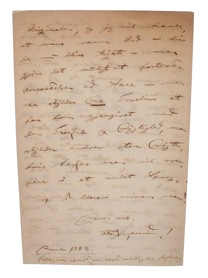 4 sider 8vo. "Maa jeg takke Dem og Deres ærede / Hr. Kollega for den tilsendte Bog, / som jeg, for Topelius's skyld, har / skrevet em varm Anbefaling for / og sendt til "Fædrelandet" - hvor- / vidt den nu bliver trykt i / denne travle Tid, veed jeg ikke. / Da jeg troer, at Topelius's "Läsning / før Barn" bør komme danske / Børn til Gode, og jeg er overbe- / vist om, at hvis man angreb / foreliggende Begyndelse til en / Oversættelse, man da let vilde / standse hele Foretagendet, valgte / jeg, skjønt med noget Samvit- /tighedsnag, at tale saa meget / som mulig om Topelius's Børne- / digtning i Almindelighed, og saa / lidt som mulig om denne Over- / sættelse, thi jeg troer ikke, den / er, som den burde være. / Den er - i de Fortællinger jeg / har konfereret - ikke tro, og / har ikke været heldig med / at træffe Tonen i det Hele / taget, ligesom Oversætterens Ind- / og Udgange ikke vedkommer / Topelius og ikke burde bæres / frem under denne udmær- / kede Digters Vinger. Ikke / heller burde de karakteristiske / Digte og maaske heller ikke / de dramatiske Smaating saa / godt som ikke være repre- / senterede. / Jeg vælger at skrive dette Brev / til Dem privat, da jeg ikke / kjender meget til Deres Hr. / Kollega og jeg gjerne vilde / lade disse Indvendinger bli- / ve mellem os. Men for Topelius's skyld maatte jeg / udøse mit Hjerte, thi han / fortjener at oversættes saa / godt og saa tro som mulig. / - Da her imidlertid findes saa / faa Kjendere og Yndere af svensk / Digtning, og det desuden er / midt i Aarets travleste Tid / er der neppe Nogen / der sam- / menligner Oversættelsen med / Originalen, og jeg vil baade / at mine varme Ord - hvis / de nu blive trykte - maa / gjøre det muligt at fortsætte / Oversættelsen ad Aare - men / saa skylder De Topelius at / faa ham gjengivet med / den Troskab og Dygtighed, man / skylder enhver stor Digter, / hvis værker man vil over- / føre i et andet Sprog. / Dixi et liberavi animam meam! / Deres ærb. / Otto Borchsenius. / December 1868. / (Blev ikke afsendt, men sagt mundtlig til Michaelsen)"