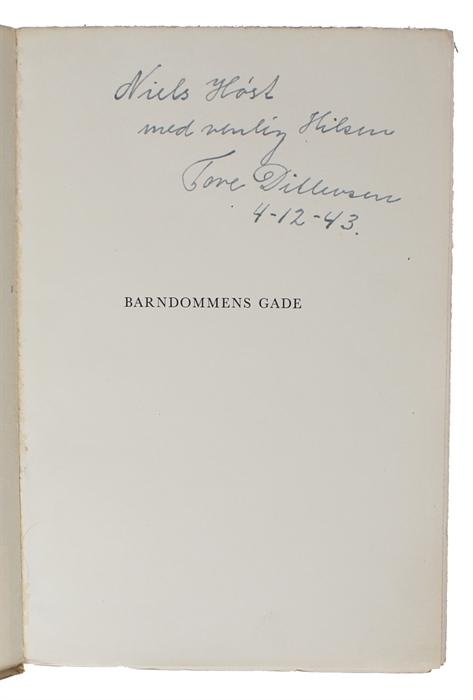 8vo. Uncut in the original printed wrappers. Illustration on front wrapper by Arne Ungermann. With dedication from the author to front free end-paper: "Niels Høst / Med venlig Hilsen / Tove Ditlevsen / 4-12-43". (i.e. English: "Niels Høst / With kind regards / Tove Ditlevsen / 4-12-43"). Bookseller-label pasted on to verso back-wrapper. Light miscolouring to spine, otherwise very fine and clean.