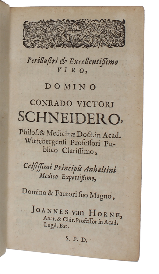Scarce second edition of Van Horne's famous "Introductio". Van Horne was a respected anatomist and appouinted professor of anatomy in Leiden. With the assistance of Swammerdam he investigated the ovaries and published his observations in "Prodomus" (which is present in the item offered). These observations played some role in the priority dispute between Regnier de Graff and Swammerdam. His Introductio (Microcoasmus) was much in demand and was translated into Dutch, German and French (offered here under the title "Mikpotexnh". - Waller: 4912.- Wellcome III, p. 301 a.